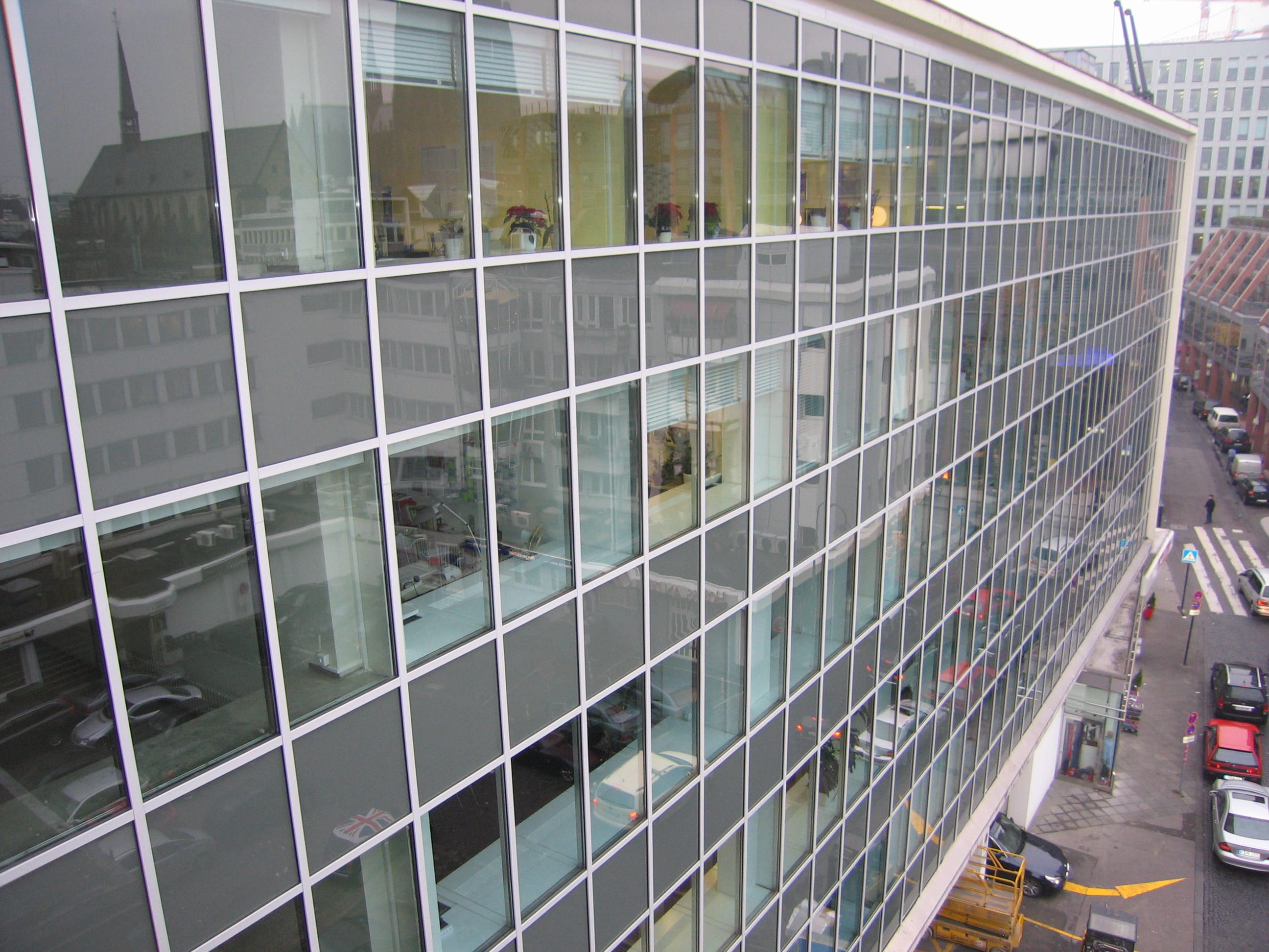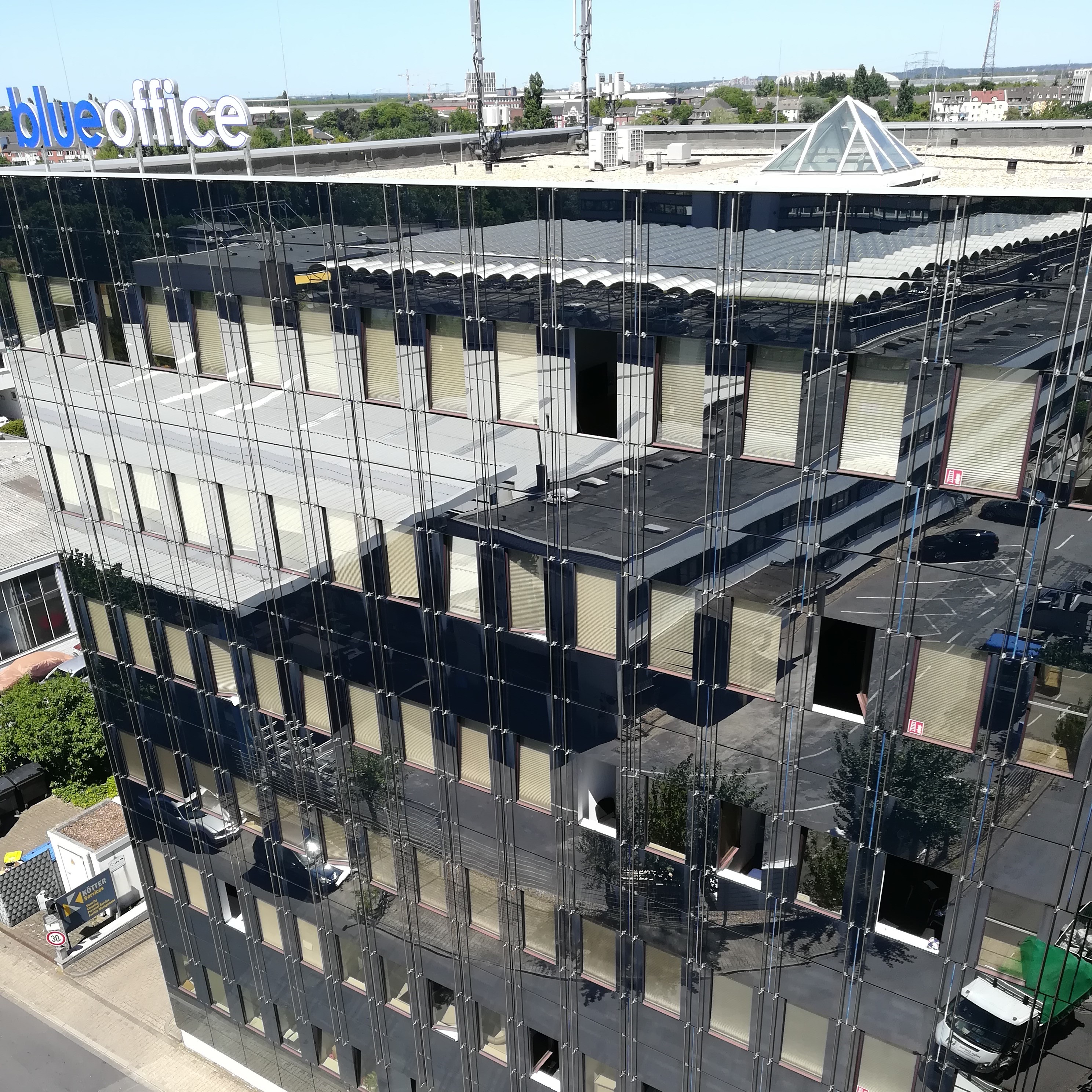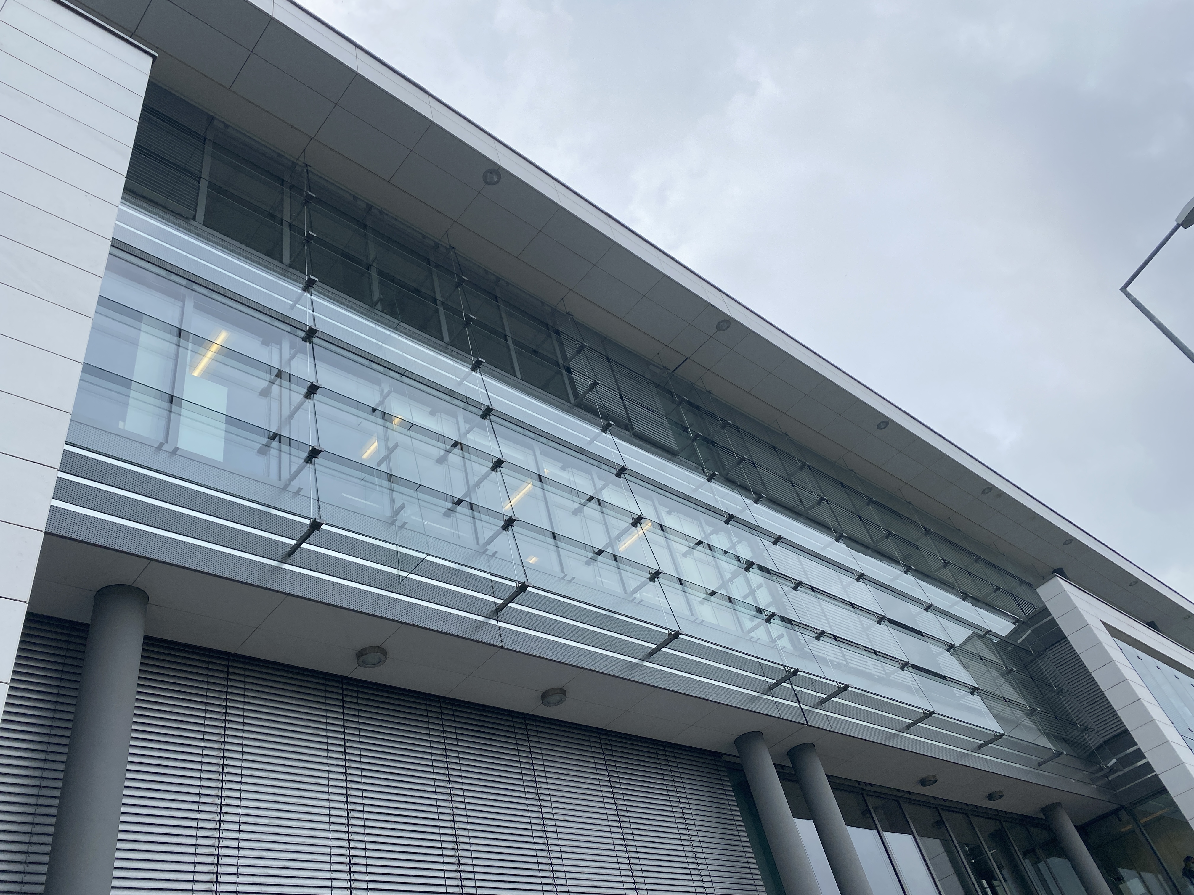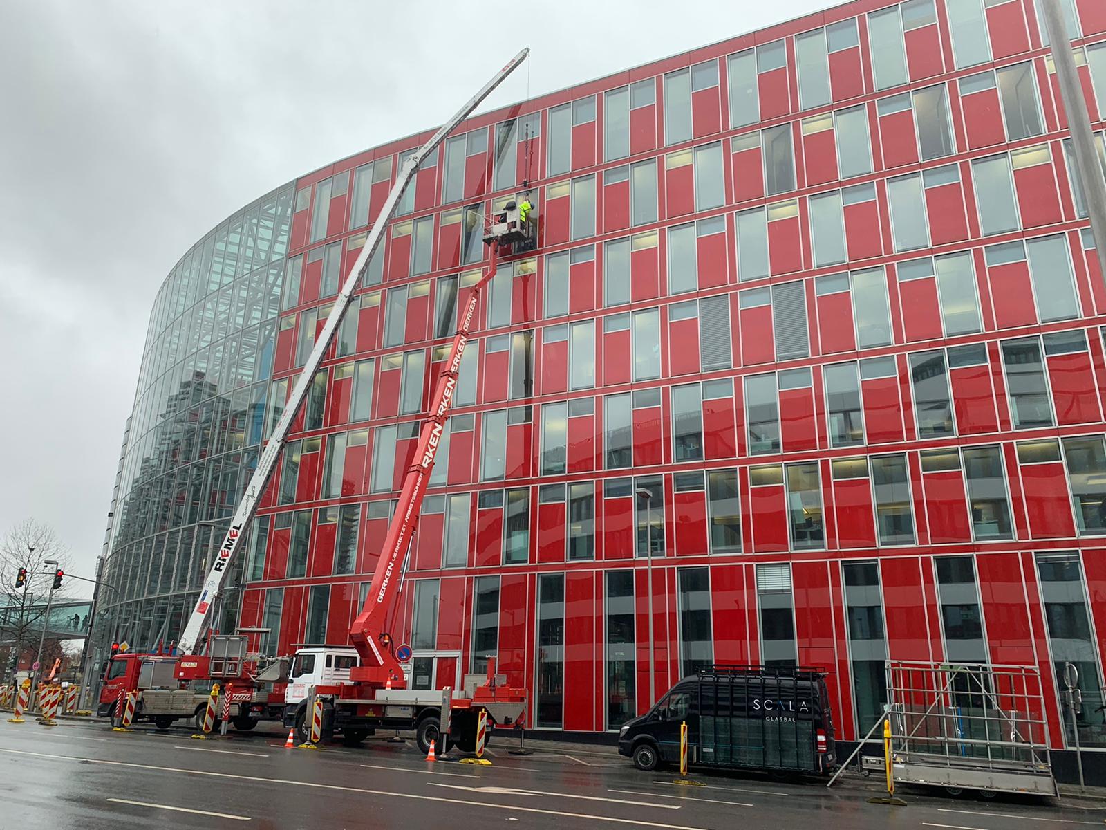 2018 war es unsere Aufgabe, die elegante, blau getönte Glasfassade im vollständigen Umfang über mehrere Wochen komplett zu sanieren.