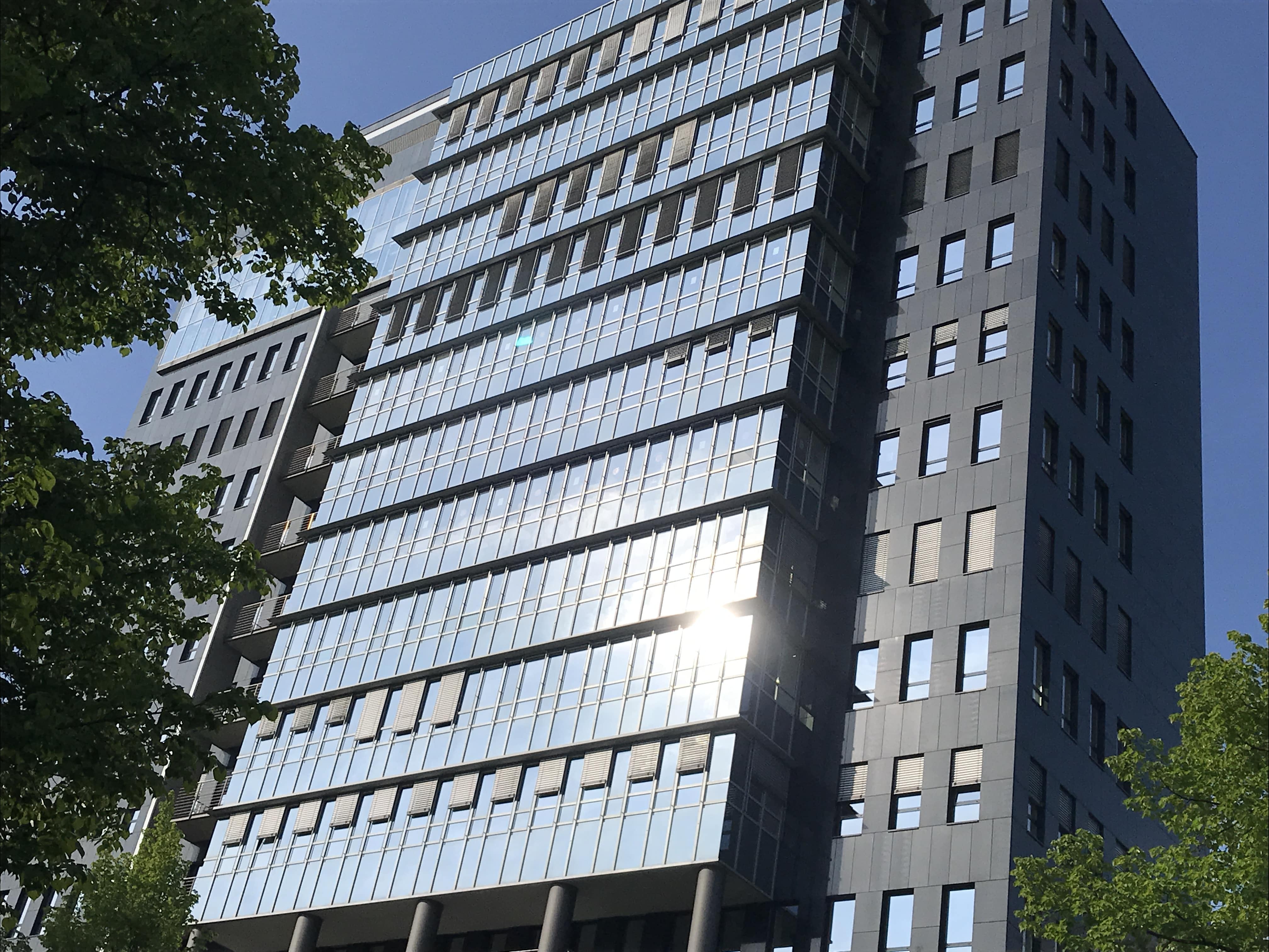 2018 war es unsere Aufgabe, die elegante, blau getönte Glasfassade im vollständigen Umfang über mehrere Wochen komplett zu sanieren.